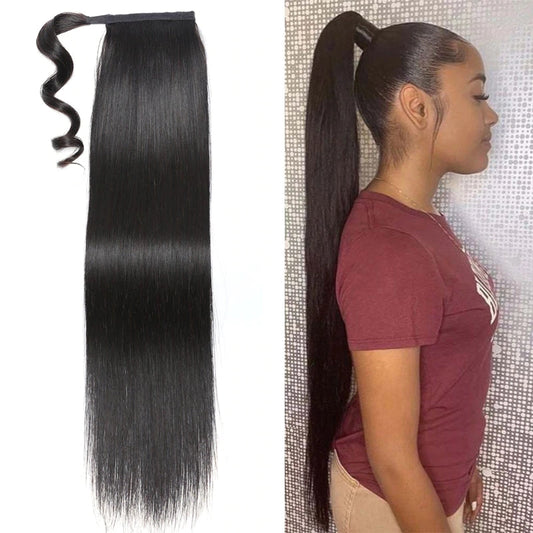 Instant ponytail Extensions Yaki Kinky Straight 100% Human hair natural black